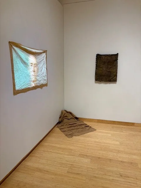 stillpoint (2024) as part of Soft/Cover: cotton, polyester, sublimation print, latex, burlap, zinc nails, video projection.
