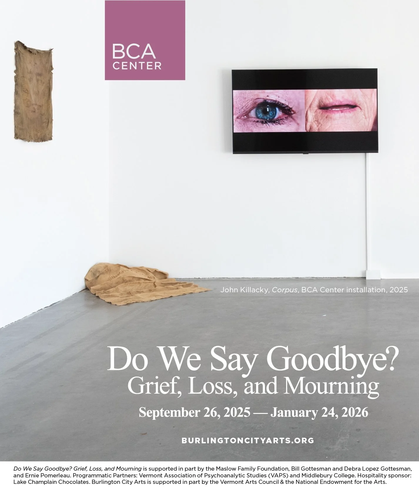 CORPUS: Worked with a community of artists to create a meditative reflection of our bodies that have been demonized, weaponized, politicized. Joining me are cisgendered and trans folx, queer and straight, with varying abilities. Featured in Do We Say Goodbye? Grief, Loss, and Mourning September 26, 2025 – January 24, 2026 at Burlington City Arts Gallery. Screenings: Fabric Workshop and Museum, Philadelphia; U of AL, Birmingham; Chronic Pain Program, UVMMC, South Burlington; Pollen: Video Spells, Brooklyn; and AVA Gallery and Art Center, Lebanon.